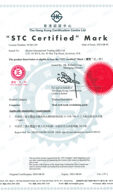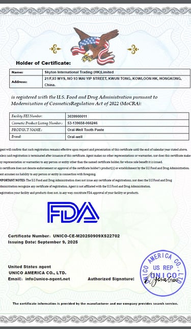 FDA簽發的證書,提升 Oral-well 牙膏國際市場上的信譽與合規形象。展現了
